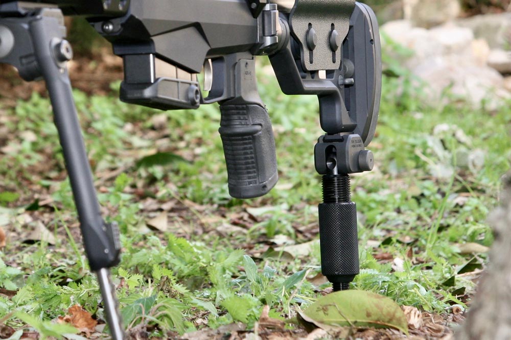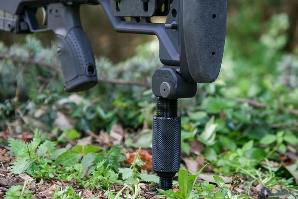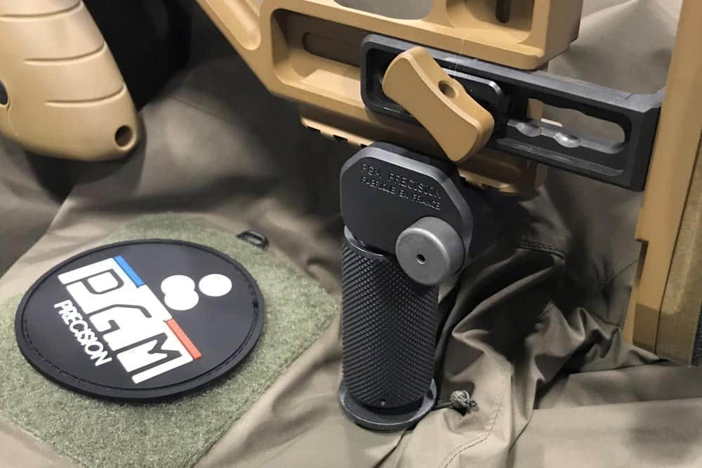 Lors de la visée, la béquille de crosse PGM se règle en hauteur avec une précision micrométrique en tournant simplement la poignée. Cette précision extrême dans le réglage ainsi que la stabilité apportée par l’appuis au sol sur l’arrière de l’arme permettent un ajustement ultra précis de la visée.